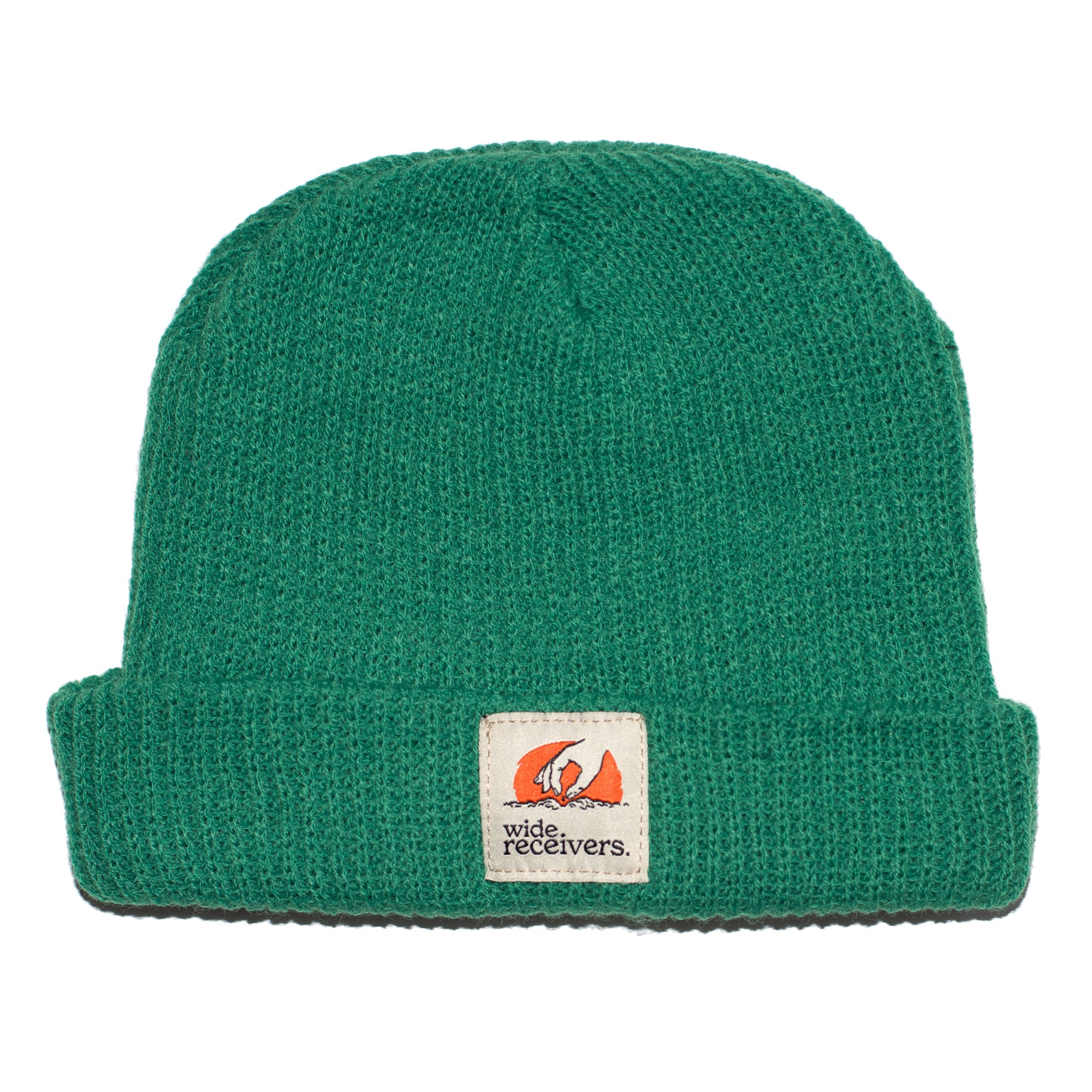 Acrylic medium-knit beanie with hand-sewn WR tag on temple. The green version is shorter than the black/navy ones, sitting just above the ear.